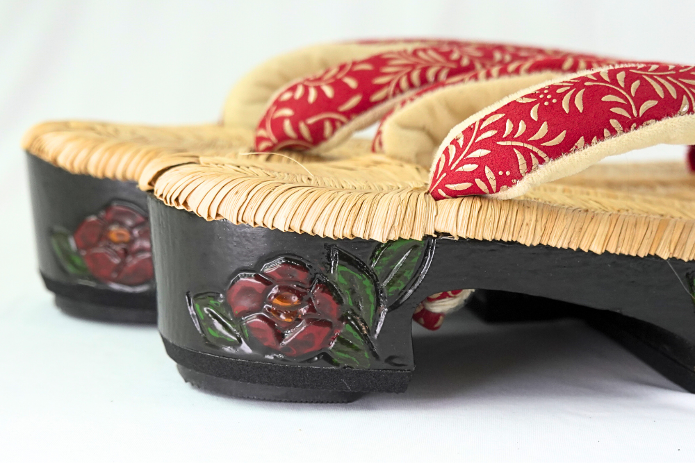 さらりとした足当たりが心地よい、上質な野崎畳表(のざきたたみおもて)を使用したお履き物です。こちらの最大の特徴は、かかとの部分に施された「椿」の素晴らしい彫りです。歩くお姿の後ろ姿に、チラリと覗く日本の伝統美。控えめでありながらも確かな存在感を放つその細工は、本物を見極める大人の女性にこそふさわしい粋な計らいです。