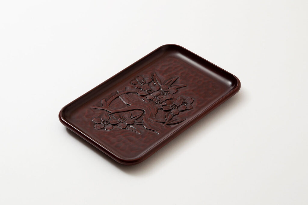 ご祝儀などを丁寧にお渡しする際や日常のちょっとしたアクセサリー置き、玄関先の小間物トレイとしても活躍する「切手盆」です。 艶やかな漆黒のキャンバスに、ふっくらとした桜の花びらが大胆かつ繊細に彫り上げられています。奥ゆかしい日本の美意識を感じさせるこの一枚は、空間に置くだけで上品な春の気配を一年中漂わせてくれます。